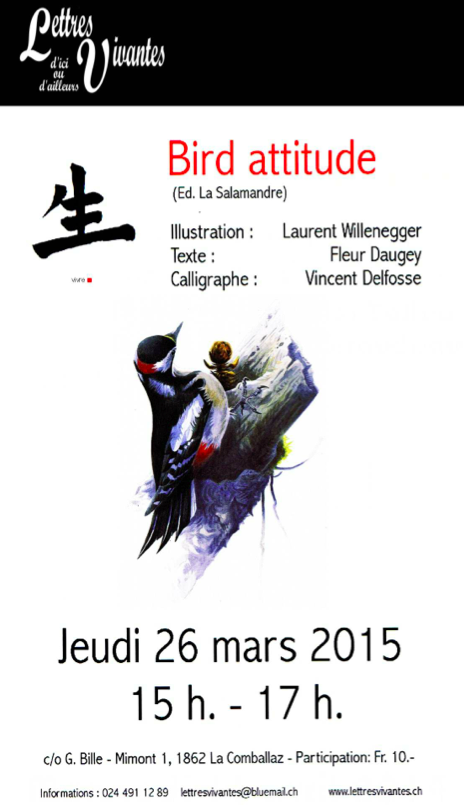 Pour accompagner la causerie-expo de Laurent Willenegger autour de l’ouvrage Bird Attitude, retrouvez à la Comballaz quelques calligraphies originales faites pour cet ouvrage. Une belle occasion de nous rencontrer à la montagne !